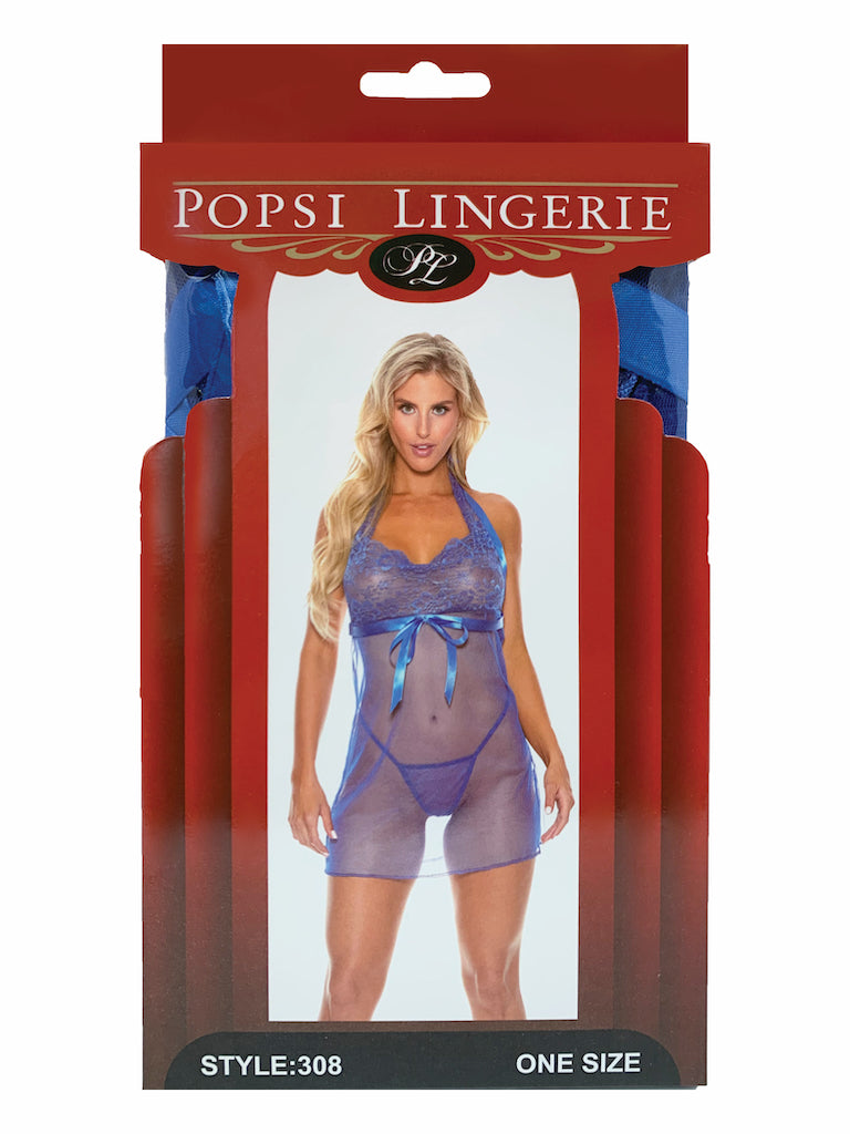 Popsi Sapphire mesh and lace babydoll halter teddy in one size with sheer floral lace bodice and breathable mesh panels for submission training and power exchange scenes.